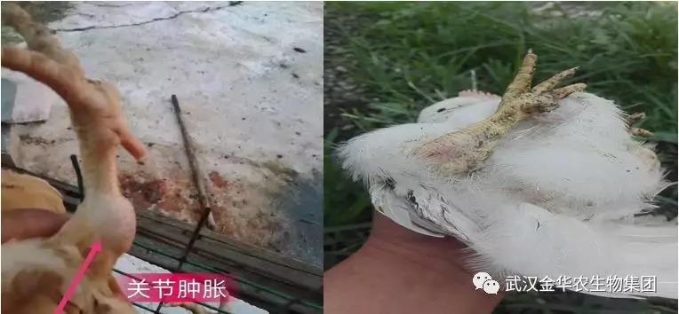 劉姐開始用替米考星加上鹽酸多西環(huán)素用了10天,效果不理想,后來加了4天強(qiáng)力霉素和泰勒菌素,癥狀減輕但是腫脹依舊明顯,出現(xiàn)了越來越多的癱雞,極度消瘦,精神沉郁的病雞。劉姐晚上翻來覆去睡不著,翻閱網(wǎng)上各種資料,后來看到有一個產(chǎn)品叫“滑囊藍(lán)金”方案還不錯,就抱著試試的態(tài)度在網(wǎng)上找到了華中農(nóng)業(yè)大學(xué)校企合作單位---武漢金華農(nóng)生物科技有限公司,禽病技術(shù)專家姚教授、趙教授確診為滑液囊支原體后推薦劉姐使用“滑囊藍(lán)金”方案。連用7天一療程。