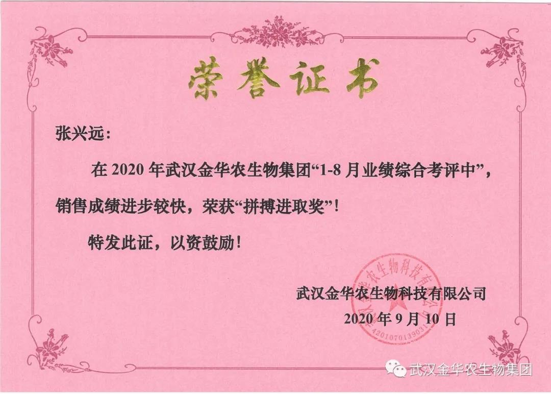 祝賀廣東張興遠經理,他在2020年武漢金華農生物集團“1-8月業(yè)績綜合考評中”銷售成績進步較快,他拼搏進取,踴躍報貨,榮獲武漢金華農老人團隊“拼搏進取獎”,他是一位優(yōu)秀的“老武漢金華農人”,為他鼓掌!為他點贊!