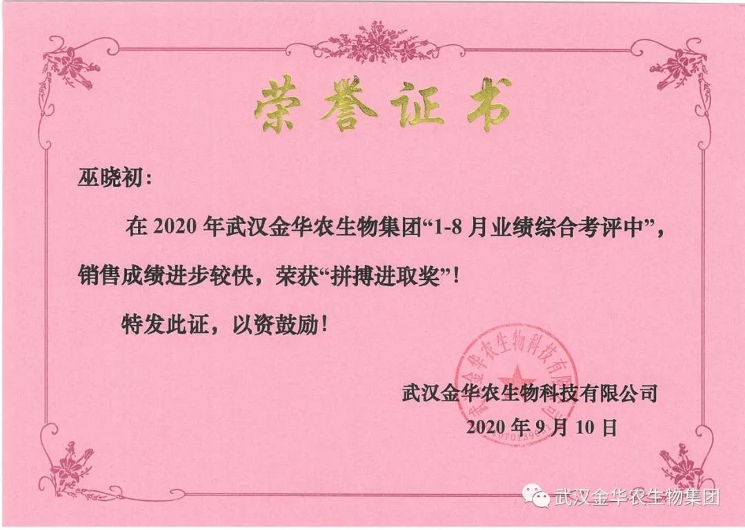 祝賀福建巫曉初經理,他在2020年武漢金華農生物集團“1-8月業(yè)績綜合考評中”銷售成績進步較快,他拼搏進取,踴躍報貨,榮獲武漢金華農老人團隊“拼搏進取獎”,他是一位優(yōu)秀的“老武漢金華農人”,為他鼓掌!為他點贊!