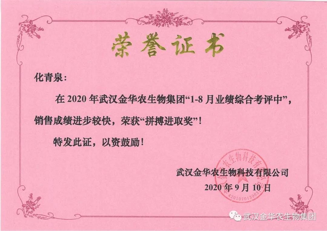祝賀山東化青泉經理,他在2020年武漢金華農生物集團“1-8月業(yè)績綜合考評中”銷售成績進步較快,他拼搏進取,踴躍報貨,榮獲武漢金華農老人團隊“拼搏進取獎”,他是一位優(yōu)秀的“老武漢金華農人”,為他鼓掌!為他點贊!