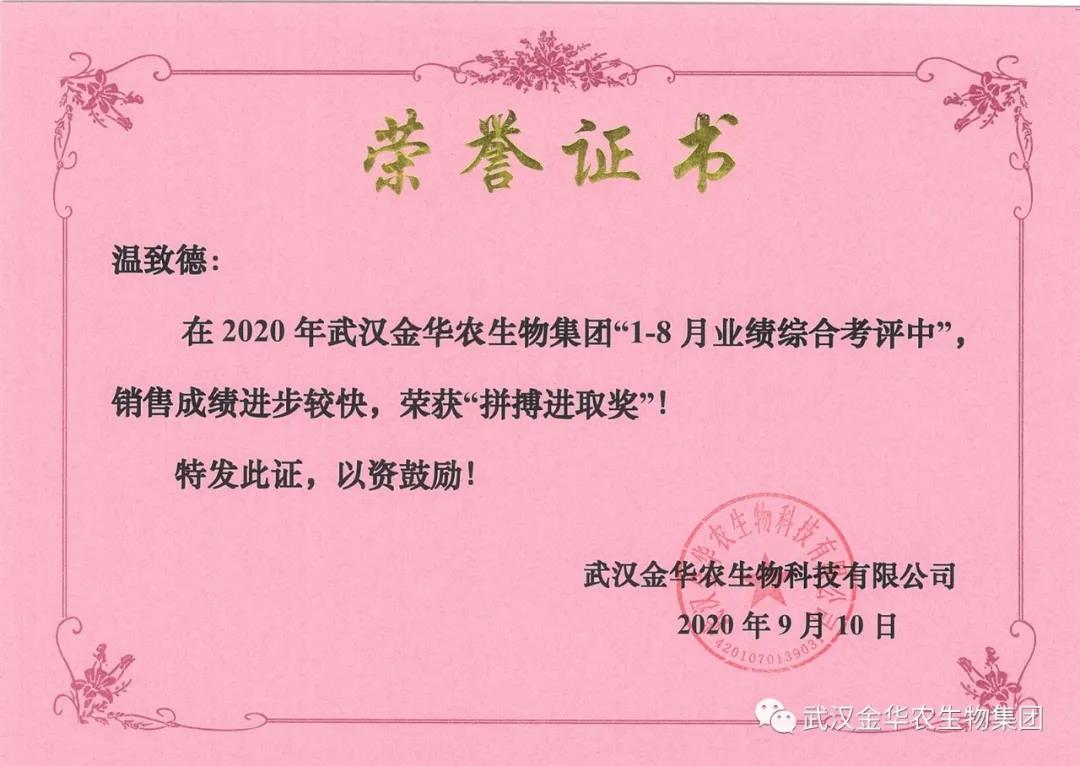 祝賀江西溫致德經理,他在2020年武漢金華農生物集團“1-8月業(yè)績綜合考評中”銷售成績進步較快,他拼搏進取,踴躍報貨,榮獲武漢金華農老人團隊“拼搏進取獎”,他是一位優(yōu)秀的“老武漢金華農人”,為他鼓掌!為他點贊!