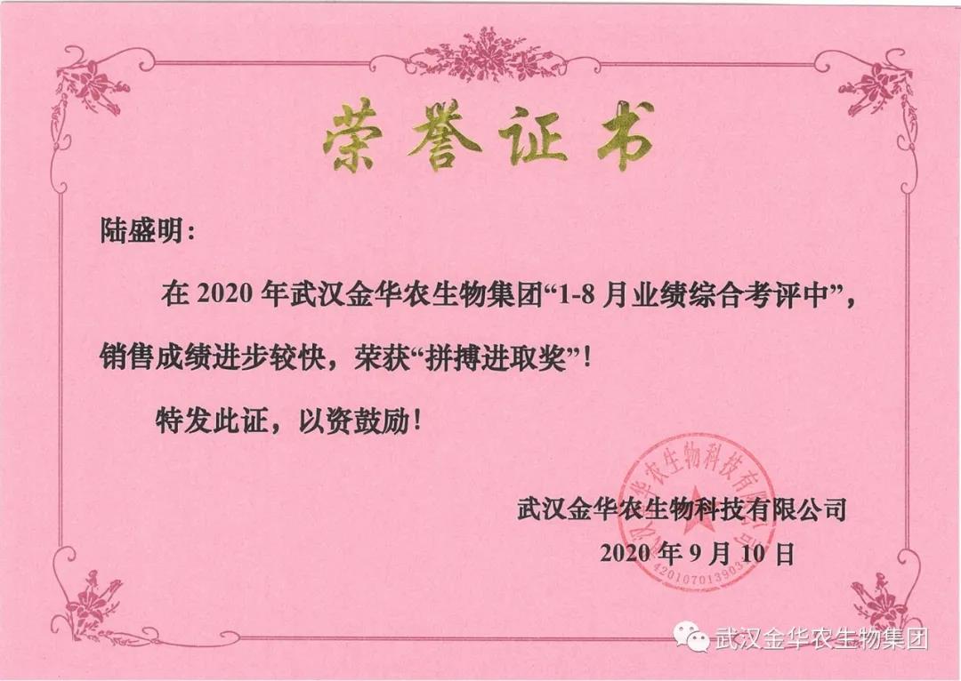 祝賀廣西陸盛明經理,他在2020年武漢金華農生物集團“1-8月業(yè)績綜合考評中”銷售成績t步較快,他拼搏進取,踴躍報貨,榮獲武漢金華農老人團隊“拼搏進取獎”,他是一位優(yōu)秀的“老武漢金華農人”,為他鼓掌!為他點贊!