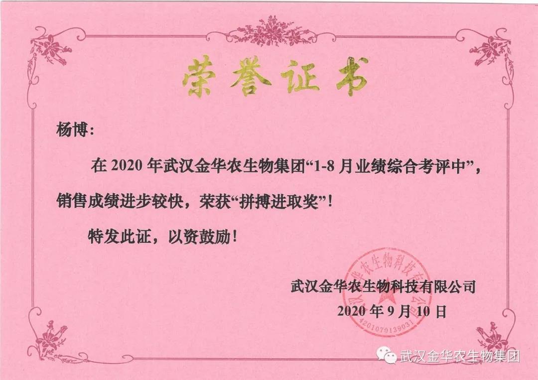 祝賀黑龍江楊博經理,他在2020年武漢金華農生物集團“1-8月業(yè)績綜合考評中”銷售成績進步較快,他拼搏進取,踴躍報貨,榮獲武漢金華農老人團隊“拼搏進取獎”,他是一位優(yōu)秀的“老武漢金華農人”,為他鼓掌!為他點贊!
