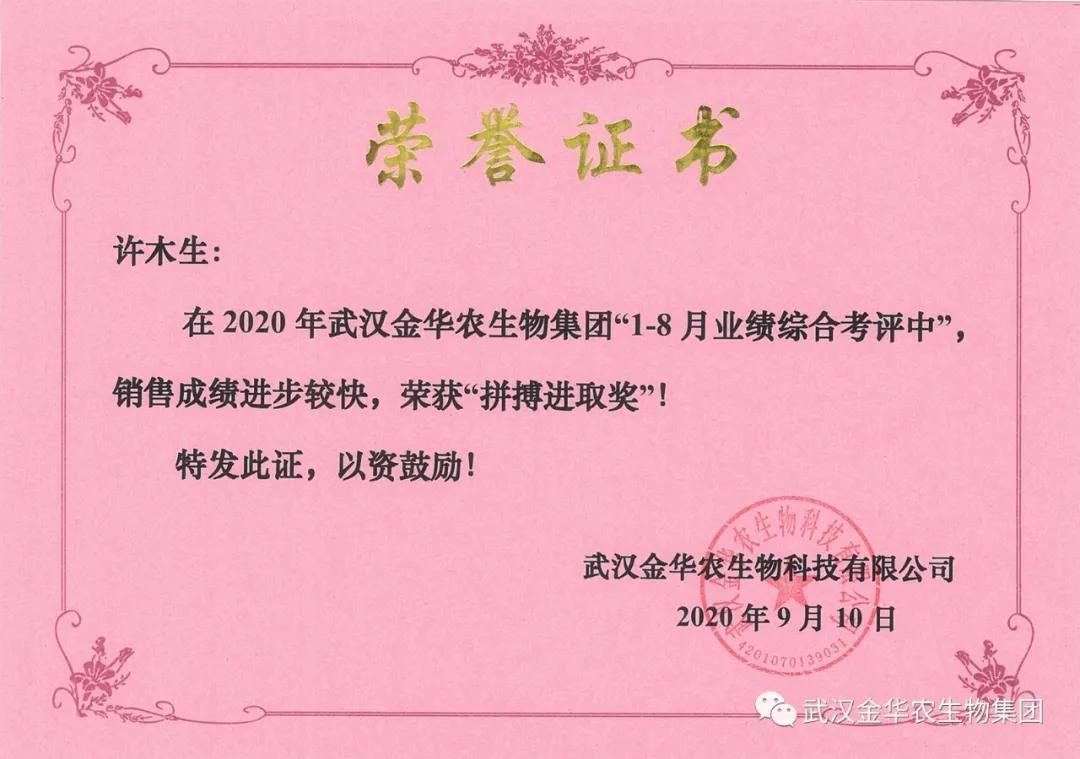 祝賀山東許木生經理,他在2020年武漢金華農生物集團“1-8月業(yè)績綜合考評中”銷售成績進步較快,他拼搏進取,踴躍報貨,榮獲武漢金華農老人團隊“拼搏進取獎”,他是一位優(yōu)秀的“老武漢金華農人”,為他鼓掌!為他點贊!