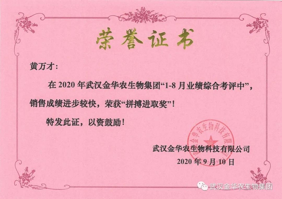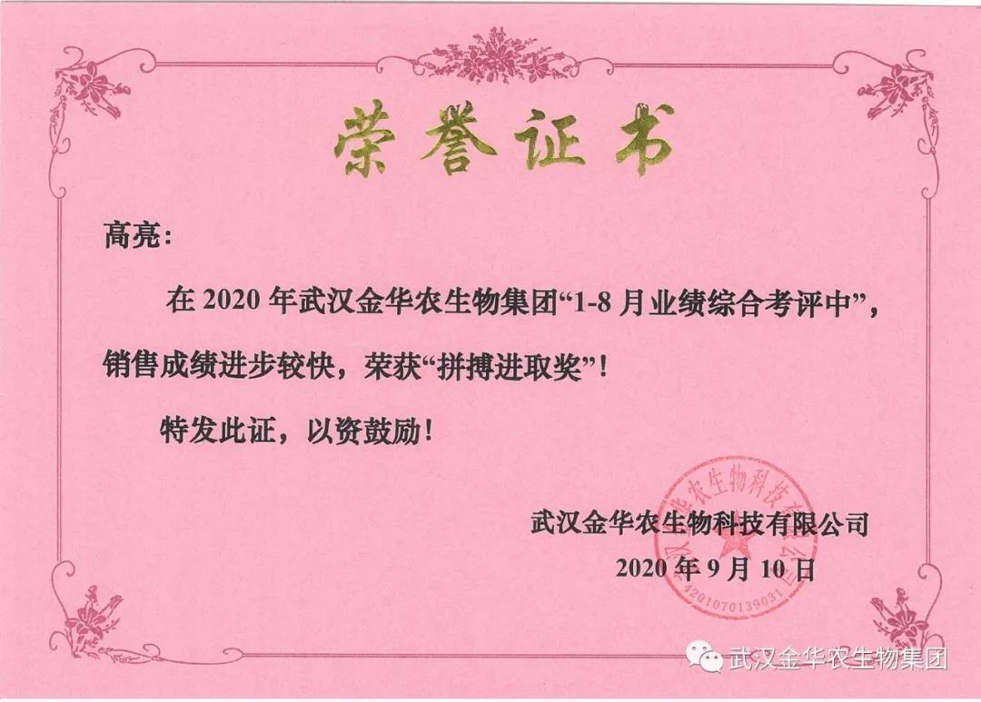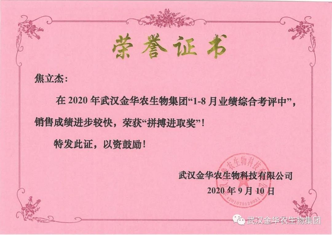 祝賀河北焦立杰經理,他在2020年武漢金華農生物集團“1-8月業(yè)績綜合考評中”銷售成績進步較快,他拼搏進取,踴躍報貨,榮獲武漢金華農老人團隊“拼搏進取獎”,他是一位優(yōu)秀的“老武漢金華農人P,為他鼓掌!為他點贊!