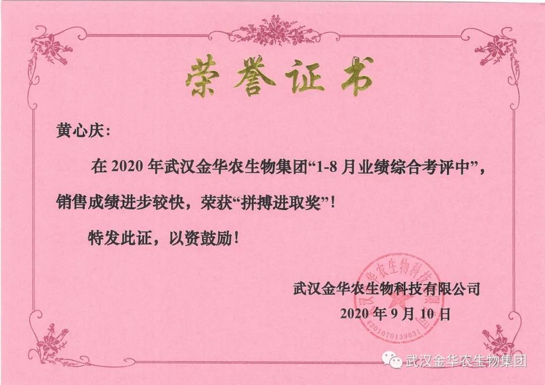 祝賀海南黃心慶經理,他在2020年武漢金華農生物集團“1-8月業(yè)績綜合考評中”銷售成績進步較快,他拼搏進取,踴躍報貨,榮獲武漢金華農老人團隊“拼搏進取獎”,他是一位優(yōu)秀的“老武漢金華農人”,為他鼓掌!為他點贊!