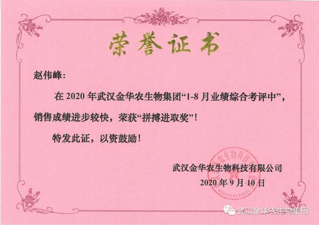 祝賀河南趙偉峰經理,他在2020年武漢金華農生物集團“1-8月業(yè)績綜合考評中”銷售成績進步較快,他拼搏進取,踴躍報貨,榮獲武漢金華農老人團隊“拼搏進取獎”,他是一位優(yōu)秀的“>武漢金華農人”,為他鼓掌!為他點贊!