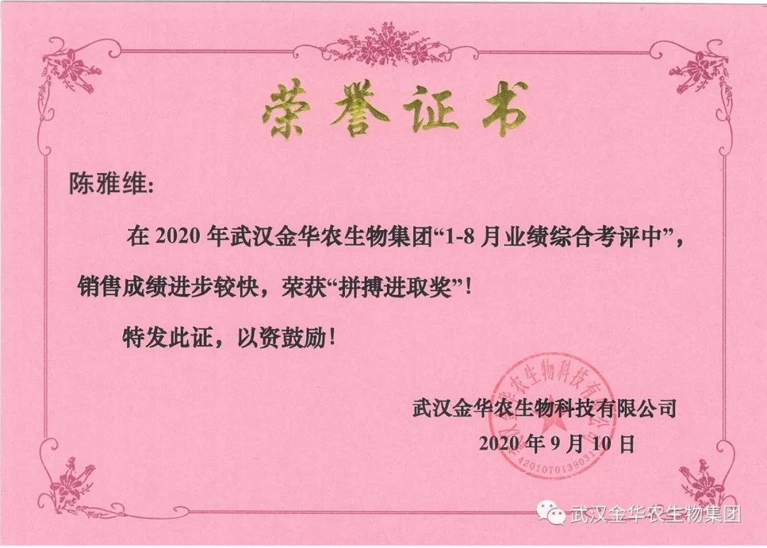 祝賀遼寧陳雅維經理,他在2020年武漢金華農生物集團“1-8月業(yè)績綜合考評中”銷售成績進步較快,他拼搏進取,踴躍報貨,榮獲武漢金華農新人團隊“拼搏進取獎”,他是一位優(yōu)秀的“新晉武漢金華農人”,為他鼓掌!為他點贊!
