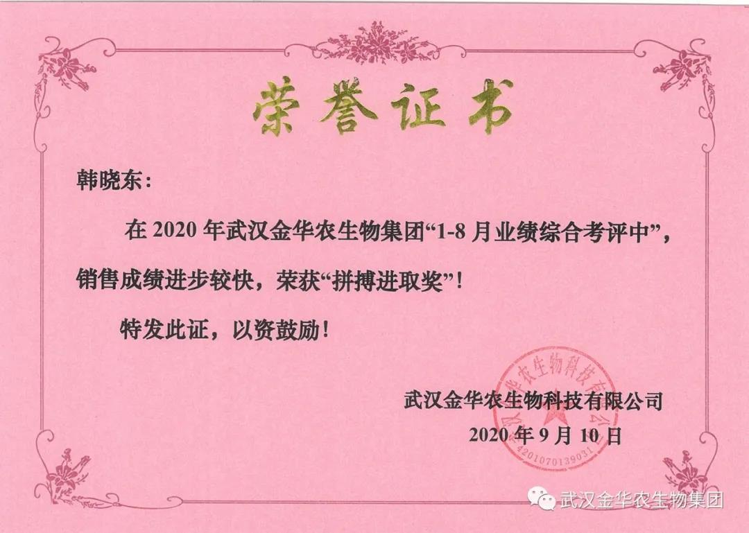 祝賀安徽韓曉東經理,他在2020年武漢金華農生物集團“1-8月業(yè)績綜合考評中”銷售成績進步較快,他拼搏進取,踴躍/貨,榮獲武漢金華農新人團隊“拼搏進取獎”,他是一位優(yōu)秀的“新晉武漢金華農人”,為他鼓掌!為他點贊!