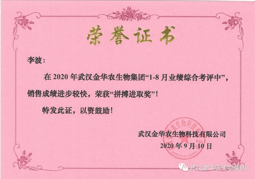 祝賀湖南李波經理,他在2020年武漢金華農生物集團“1-8月業(yè)績綜合考評中”銷售成績進步較快,他拼搏進取,踴躍報貨,榮獲武漢金華農新人團隊“拼搏進取獎”,他是一位優(yōu)秀的“新晉武漢金華農人”,為他鼓掌!為他點贊!