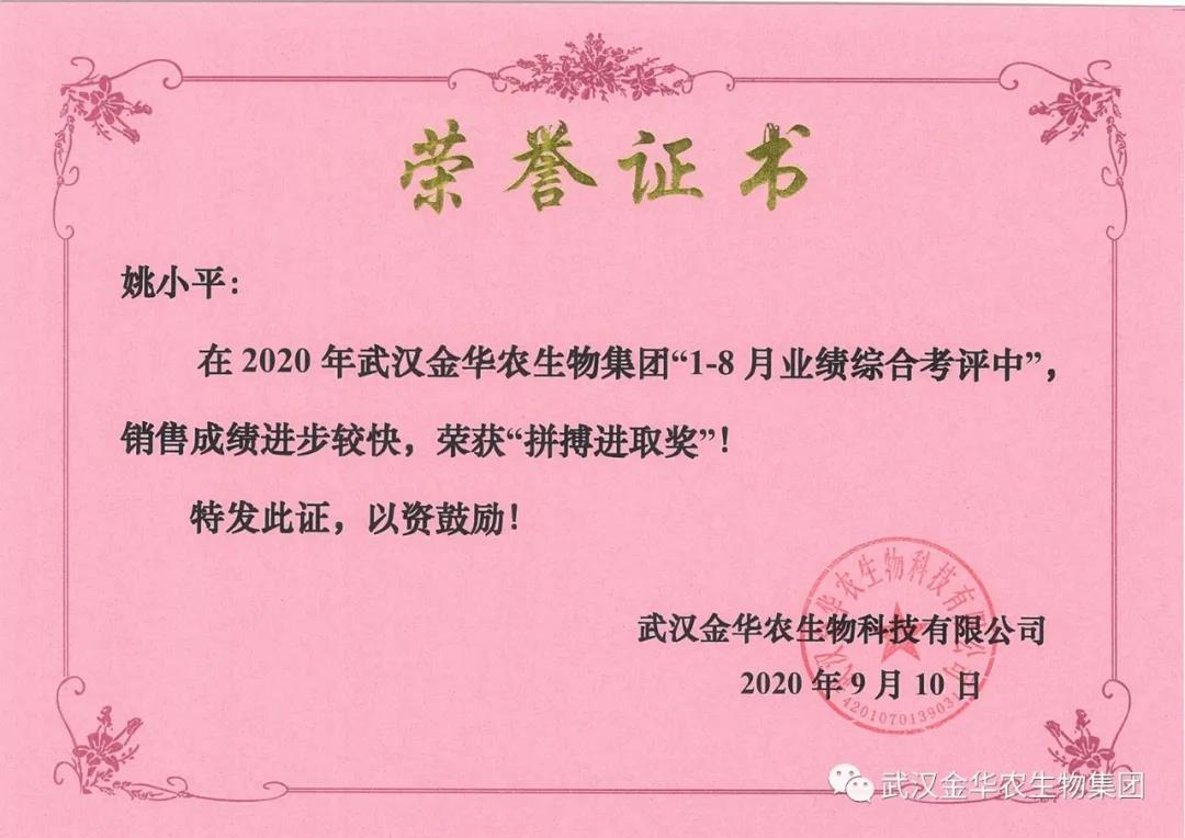 祝賀寧夏姚小平經理,他在2020年武漢金華農生物集團“1-8月業(yè)績綜合考評中”銷售成績進步較快,他拼搏進取,踴躍報貨,榮獲武漢金華農新人團隊“拼搏進取獎”,他是一位優(yōu)秀的“新晉武漢金華農人”,為他鼓掌!為他點贊!