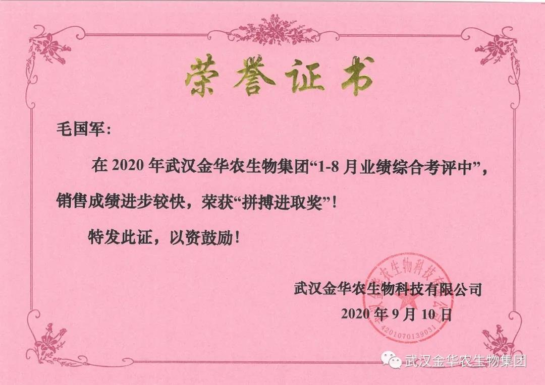 祝賀四川毛國軍經理,他在2020年武漢金華農生物集團“1-8月業(yè)績綜合考評中”銷售成績進步較快,他拼搏進取,踴躍報貨,榮獲武漢金華農新人團隊“拼搏進取獎”,他是一位優(yōu)秀的“新晉武漢金華農人”,為他鼓掌!為他點贊!