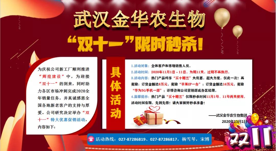 ? ? ?為慶祝公司新工廠順利推進(jìn)“輝煌建設(shè)”中,為真誠(chéng)感恩在這段不平凡歲月中奮戰(zhàn)在動(dòng)保銷售一線的武漢金華農(nóng)同仁,為迎接“雙十一”的到來(lái),同時(shí)助力各區(qū)市場(chǎng)沖刺完成2020全年銷量任務(wù)。弘揚(yáng)“公司發(fā)展我成長(zhǎng),我為公司添光彩”,“人人爭(zhēng)當(dāng)冠軍,人人爭(zhēng)當(dāng)標(biāo)兵”的企業(yè)文化精神,并真誠(chéng)感恩全國(guó)各地新老客戶的支持與厚愛(ài)。公司研究決定舉辦“雙十一”特大優(yōu)惠促銷活動(dòng)!年僅一次,超大力度!活動(dòng)內(nèi)容如下:? ? ?