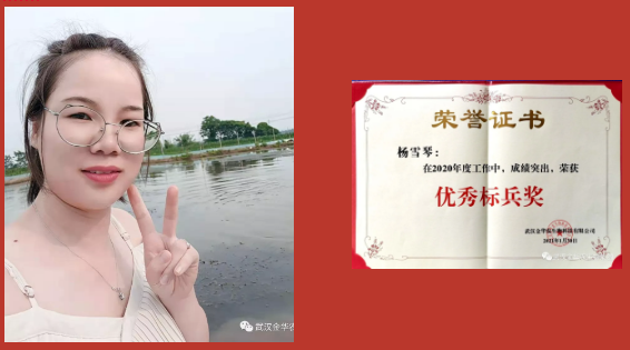 ? ? 楊雪琴在2020年營銷工作中,干練豁達,盡職盡責,圓滿完成公司各項銷售核單工作,實現(xiàn)全年“0”差錯。3年來,經(jīng)她手開具的銷售單據(jù)及對接的客戶逾3000人次,獲得一致好評。她以真誠而專業(yè)的服務(wù),樹公司品牌形象,對公司發(fā)展做出突出貢獻,被評為“優(yōu)秀標兵”。她的敬業(yè)和擔當精神值得全體武漢金華農(nóng)家人學(xué)習(xí)!