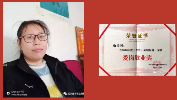 ? ? 胡夢瓊在2020年生產(chǎn)工作中,任勞任怨、持之以恒,圓滿完成公司各項生產(chǎn)任務(wù),實現(xiàn)生產(chǎn)全年“0”差錯。6年來,她熟練實操生產(chǎn)流程的每一個崗位,嚴格生產(chǎn)全流程品控,優(yōu)質(zhì)保量保供給,以堅實的產(chǎn)品保障,樹公司品牌形象,對公司發(fā)展做出突出貢獻,被評為“優(yōu)秀標兵”。她的敬業(yè)和擔當精神值得全體武漢金華農(nóng)家人學(xué)習(xí)!