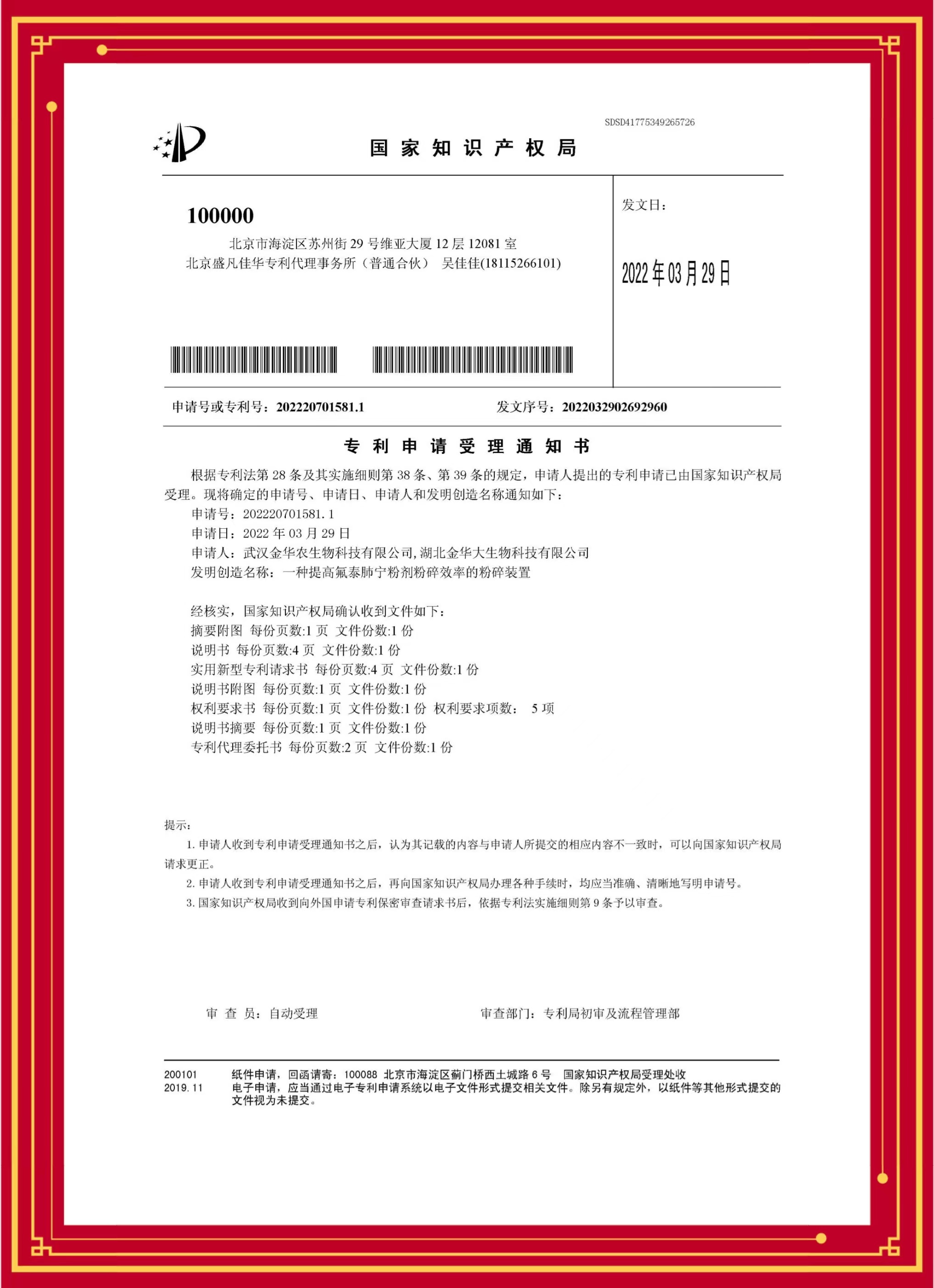 ? ? 近日,武漢金華農(nóng)申請(qǐng)的首批三個(gè)產(chǎn)品“優(yōu)樂肽、快速壯、氟泰肺寧”科技發(fā)明專利。《一種提高優(yōu)樂肽營(yíng)養(yǎng)添加劑發(fā)酵效率的發(fā)酵裝置》,專利號(hào):20220701568.6;《一種有效提高飼料添加劑快速壯包被效率的包被裝置》,專利號(hào):202220719154.6;《一種提高氟泰肺寧粉劑粉碎效率的粉碎裝置》,專利號(hào):20220701581.1,獲得國(guó)家知識(shí)產(chǎn)權(quán)局授權(quán),并獲得專利受理證書。