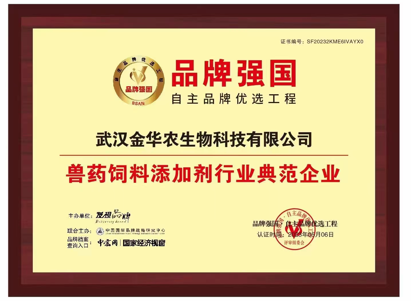 近日,武漢金華農(nóng)生物科技有限公司經(jīng)過(guò)資質(zhì)審核、輿情監(jiān)控等層層篩選,成功入選品牌強(qiáng)國(guó)·自主品牌優(yōu)選工程,并被評(píng)為“獸藥飼料添加劑典范企業(yè)”。企業(yè)信息將錄入品牌強(qiáng)國(guó)優(yōu)選工程數(shù)據(jù)庫(kù),在國(guó)家級(jí)平臺(tái)向公眾展示品牌形象。
