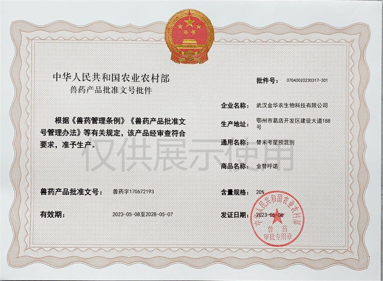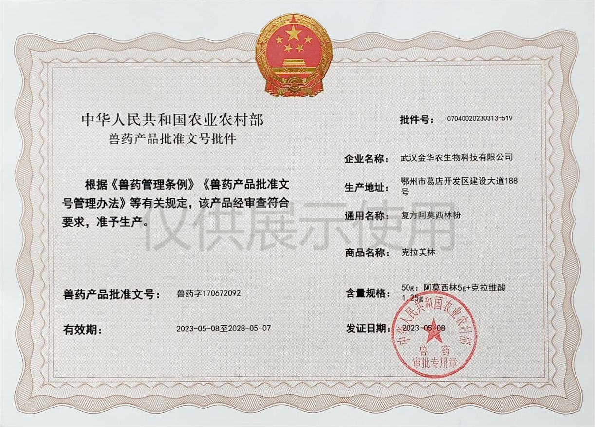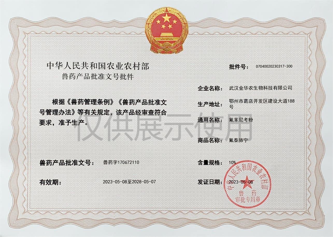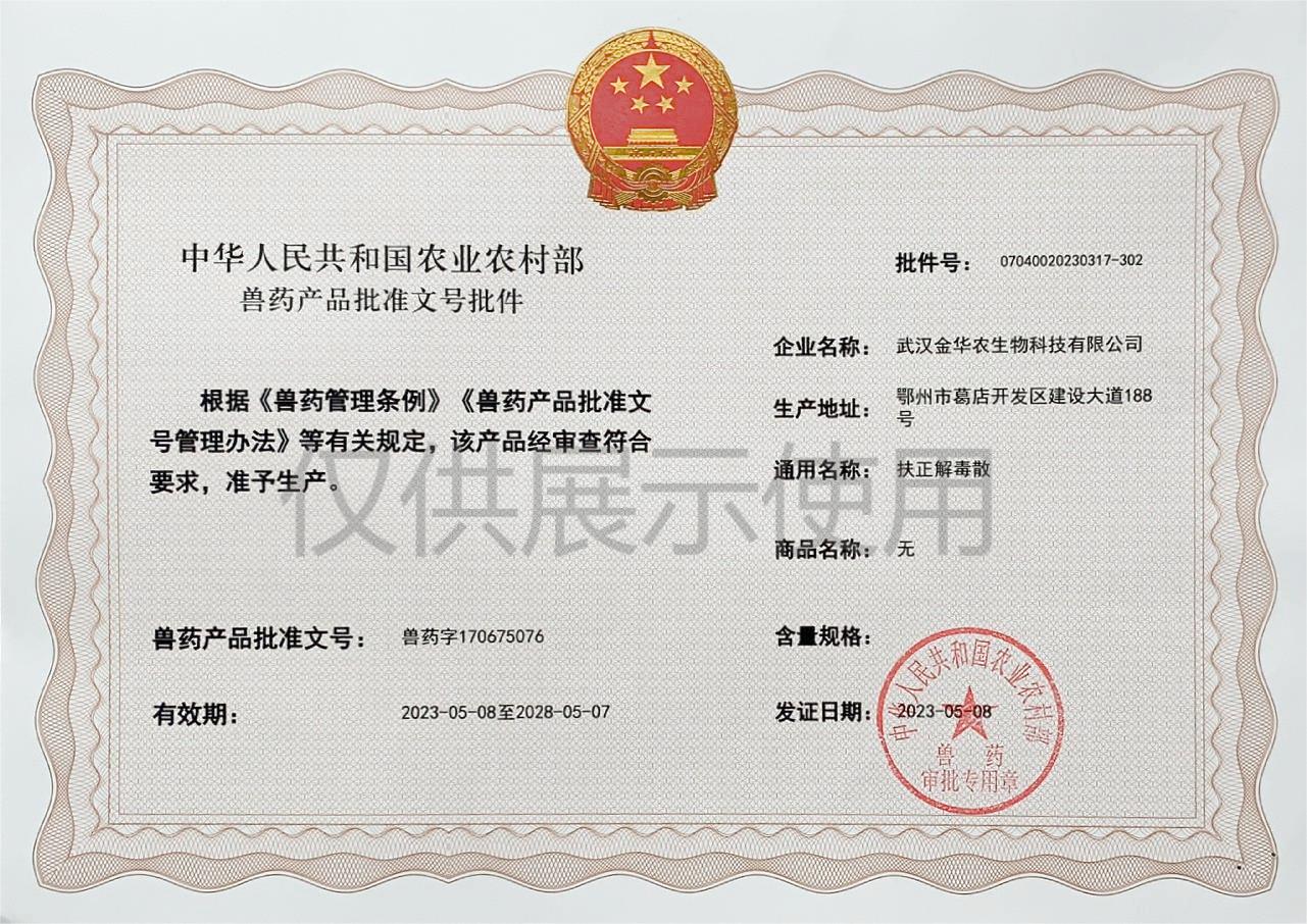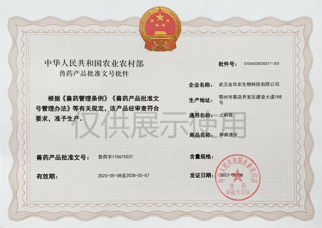 根據(jù)《獸藥管理?xiàng)l例》和《獸藥產(chǎn)品批準(zhǔn)文號(hào)管理辦法》的規(guī)定,經(jīng)國(guó)家農(nóng)業(yè)農(nóng)村部審查,準(zhǔn)予核發(fā)武漢金華農(nóng)生物科技有限公司(以下簡(jiǎn)稱“武漢金華農(nóng)生物”)國(guó)家新版GMP獸藥相關(guān)產(chǎn)品批準(zhǔn)文號(hào)。