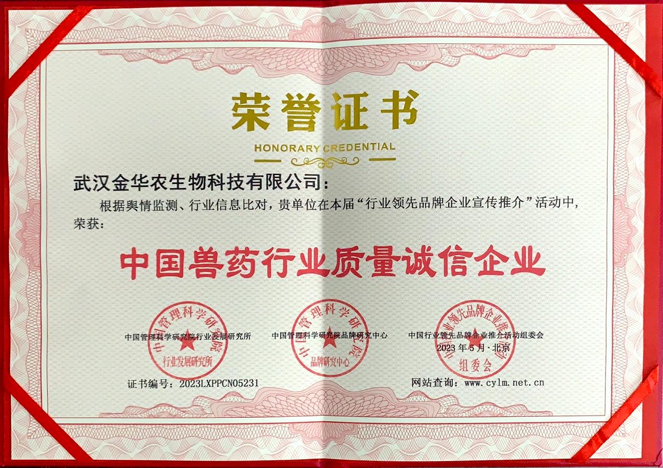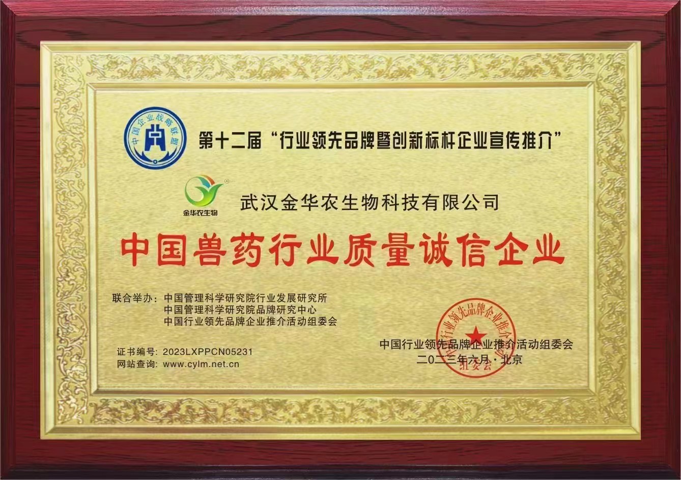 卯兔年未過半,武漢金華農(nóng)已迎來諸多利好消息。公司業(yè)績突飛猛進,銷量翻番;公司獲得省農(nóng)業(yè)農(nóng)村廳第一批新版GMP獸藥文號、飼料添加劑45個新品種批號;公司憑借專業(yè)技術(shù)、創(chuàng)新發(fā)展、高效服務,被國家信用平臺、品牌強國計劃評選為“獸藥飼料添加劑行業(yè)典范企業(yè)”。近日,公司又在中國科學研究院組織的全國自主品牌研發(fā)、科研創(chuàng)新產(chǎn)品、質(zhì)量品控管理、高校產(chǎn)學研基地建設的評選活動中,經(jīng)嚴格篩選,層層選拔,考核評比,監(jiān)督審查,被中國科學研究院組委會授予“中國獸藥行業(yè)質(zhì)量誠信企業(yè)”榮譽。