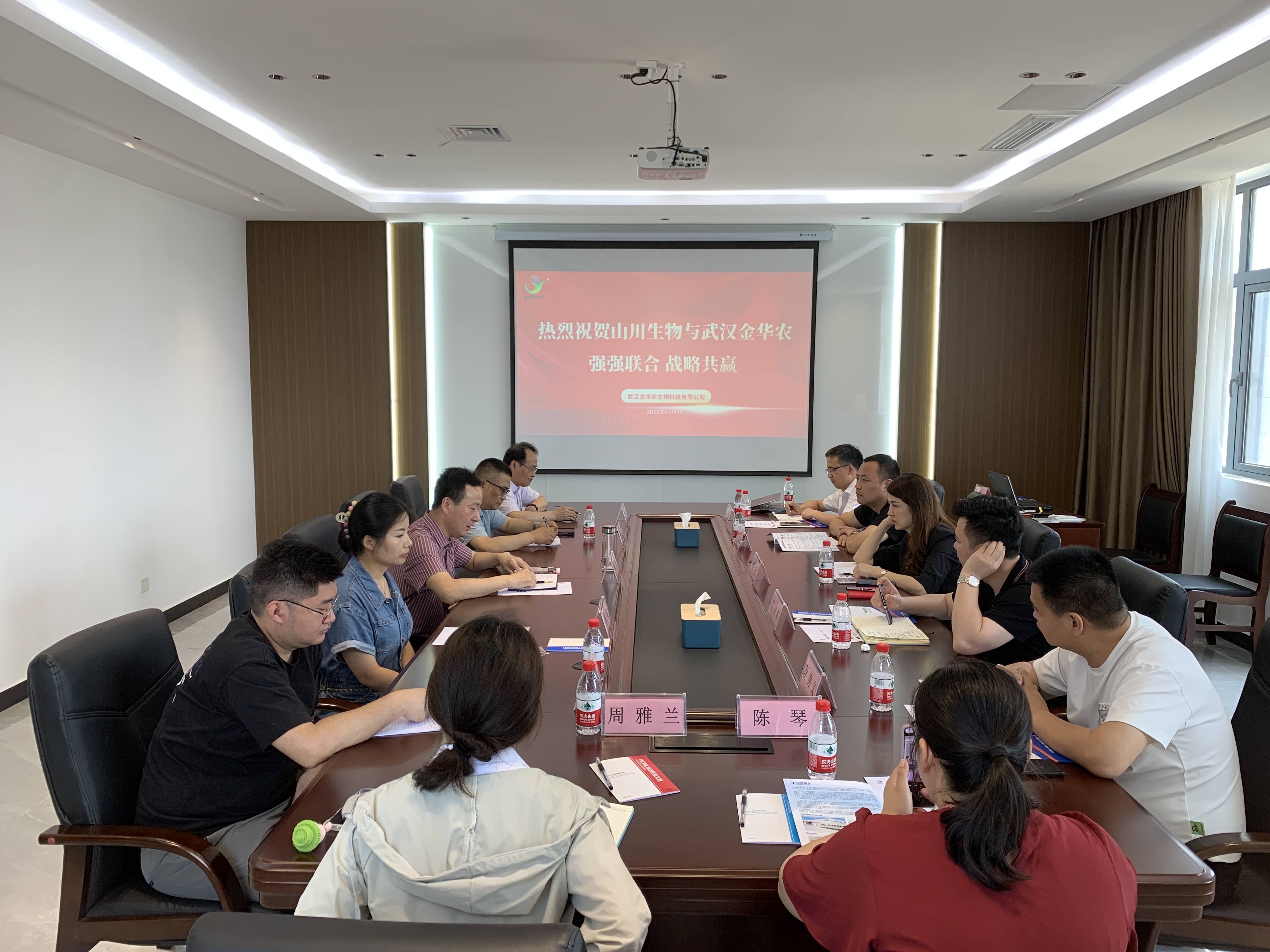 謀發(fā)展,促共贏!2023年6月8日,山川生物科技(武漢)有限公司(后文簡(jiǎn)稱(chēng)“山川生物”)高管代表團(tuán)到訪武漢金華農(nóng)生物科技有限公司(后文簡(jiǎn)稱(chēng)“武漢金華農(nóng)”),雙方就強(qiáng)強(qiáng)聯(lián)合市場(chǎng)開(kāi)拓進(jìn)行了深入交流。