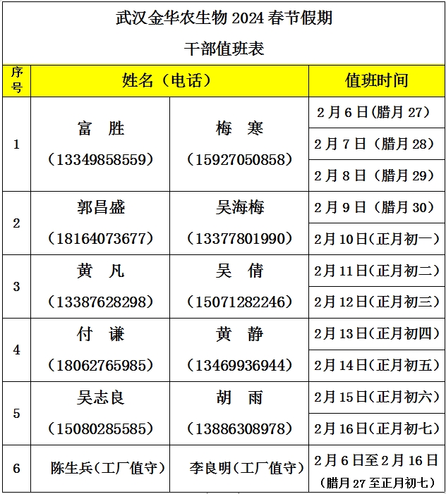 武漢金華農(nóng)2024春節(jié)假期干部值班安排