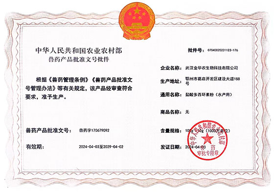根據(jù)《獸藥管理?xiàng)l例》和《獸藥產(chǎn)品批準(zhǔn)文號(hào)管理辦法》的規(guī)定,經(jīng)農(nóng)業(yè)農(nóng)村部審查,準(zhǔn)予核發(fā)武漢金華農(nóng)生物科技有限公司3個(gè)新版GMP水產(chǎn)漁藥相關(guān)產(chǎn)品批準(zhǔn)文號(hào)。