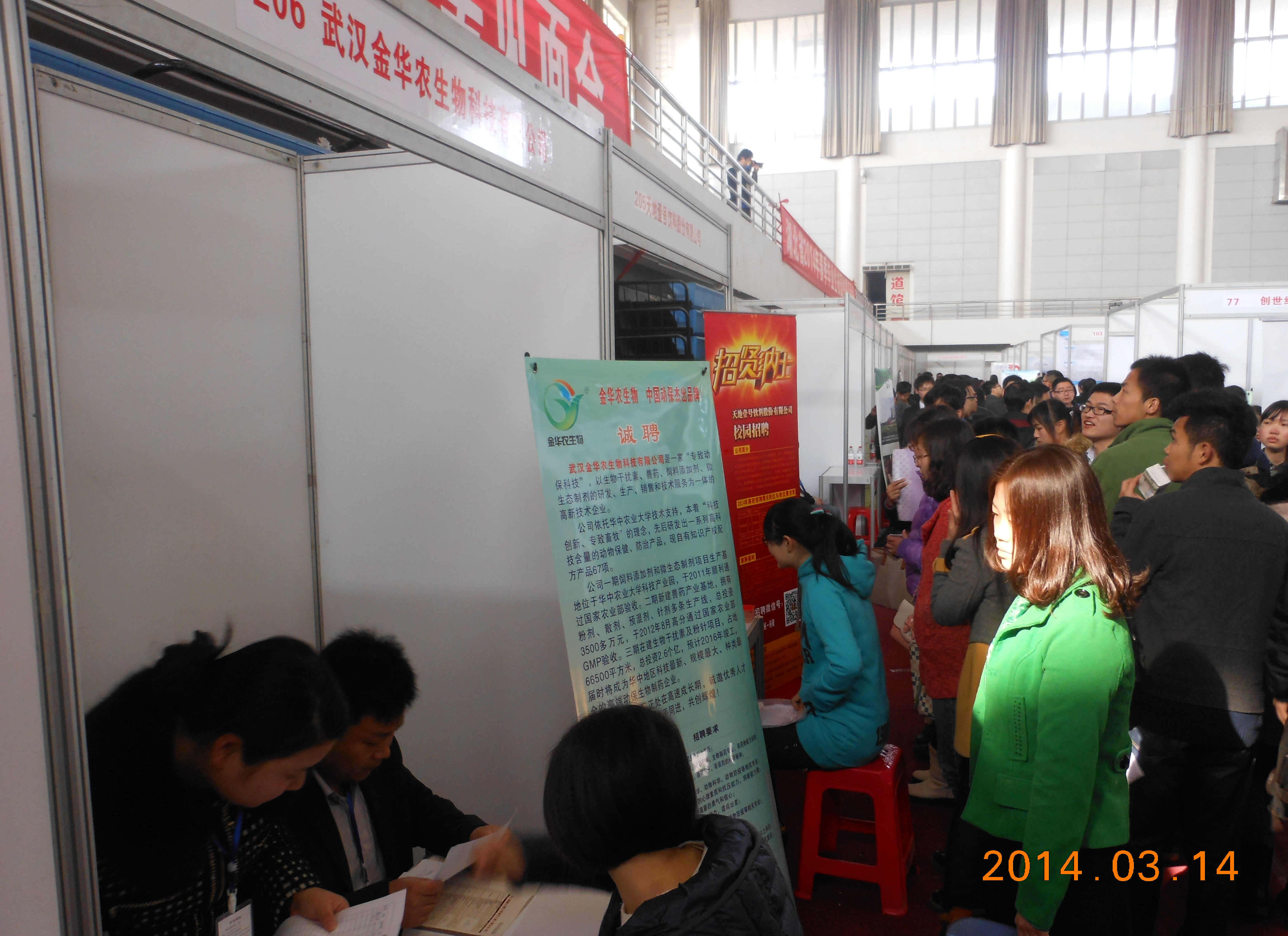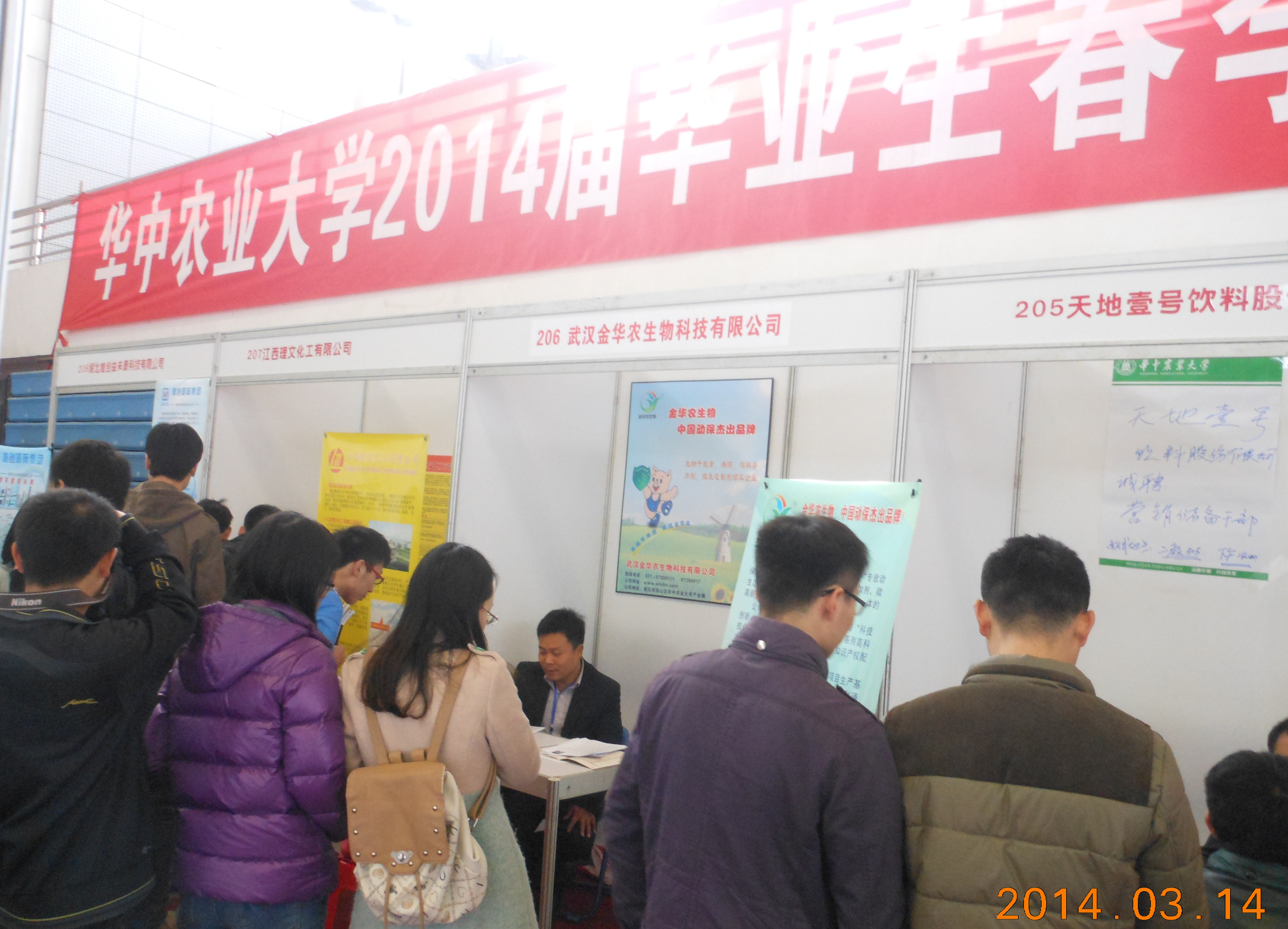 14日,華中農(nóng)業(yè)大學(xué)舉行2014屆畢業(yè)生春季供需見(jiàn)面會(huì),4850余名來(lái)自該校及附近高校的畢業(yè)生參加了現(xiàn)場(chǎng)見(jiàn)面會(huì) 。應(yīng)華中農(nóng)業(yè)大學(xué)學(xué)生工作處、華中農(nóng)業(yè)大學(xué)科技處的邀請(qǐng),武漢金華農(nóng)生物隆重出席了此次招聘會(huì),為公司的高速發(fā)展再次招攬優(yōu)秀人才。