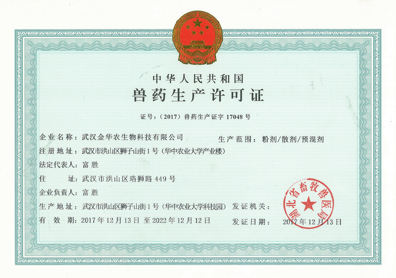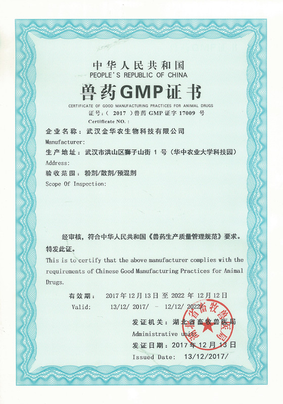 喜訊:熱烈祝賀武漢金華農(nóng)生物獲得國家農(nóng)業(yè)部“雙證件”,被中華人民共和國農(nóng)業(yè)部、湖北省畜牧局頒發(fā)“獸藥GMP證”、“獸藥生產(chǎn)許可證”兩個榮譽證件,我公司本次兩證件的獲得,有效期為5年時間,標(biāo)志著武漢金華農(nóng)生物已經(jīng)正式進入下一個5年跨越式大發(fā)展,也標(biāo)識著武漢金華農(nóng)團隊下一個5年的拼搏奮發(fā)歷程!