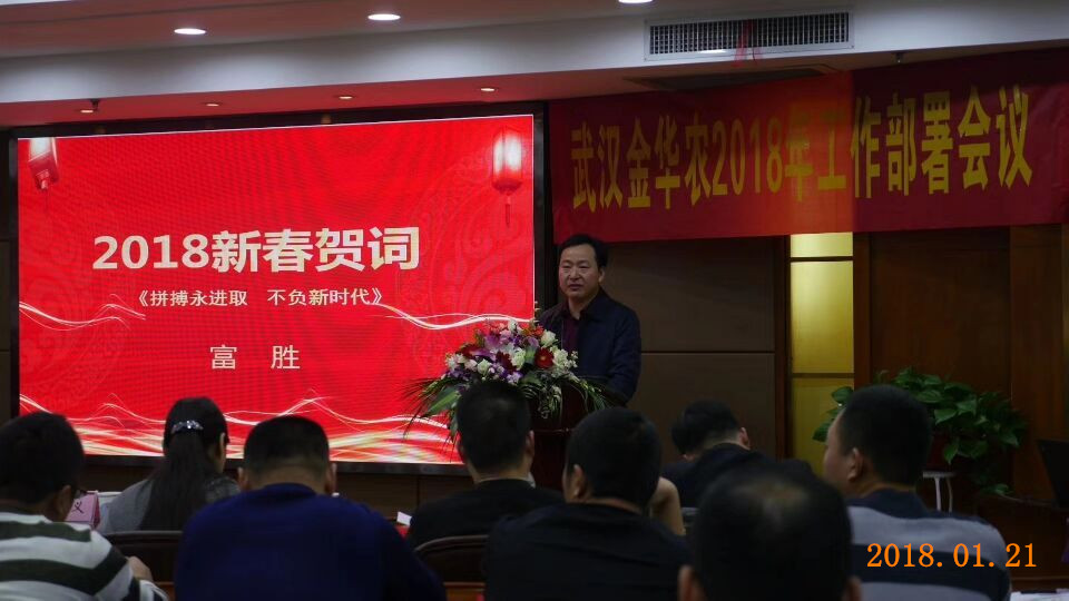 吉祥送春歸,喜慶迎春來,2018新春伊始,我們?nèi)w武漢金華農(nóng)人歡聚一堂,我謹(jǐn)代表武漢金華農(nóng)生物科技有限公司對(duì)大家的到來表示最熱烈的歡迎!代表公司向一年以來,辛勤付出、努力拼搏、圓滿完成公司各項(xiàng)工作指標(biāo)和任務(wù)的全體員工及其家屬表示最誠摯的問候!向多年以來,關(guān)心、支持、幫助武漢金華農(nóng)企業(yè)發(fā)展的各位領(lǐng)導(dǎo)、專家教授、合作伙伴和社會(huì)各界朋友們,表示最衷心的感謝!并祝愿大家在新的一年里身體健康、生活幸福、工作順心、事業(yè)進(jìn)步!