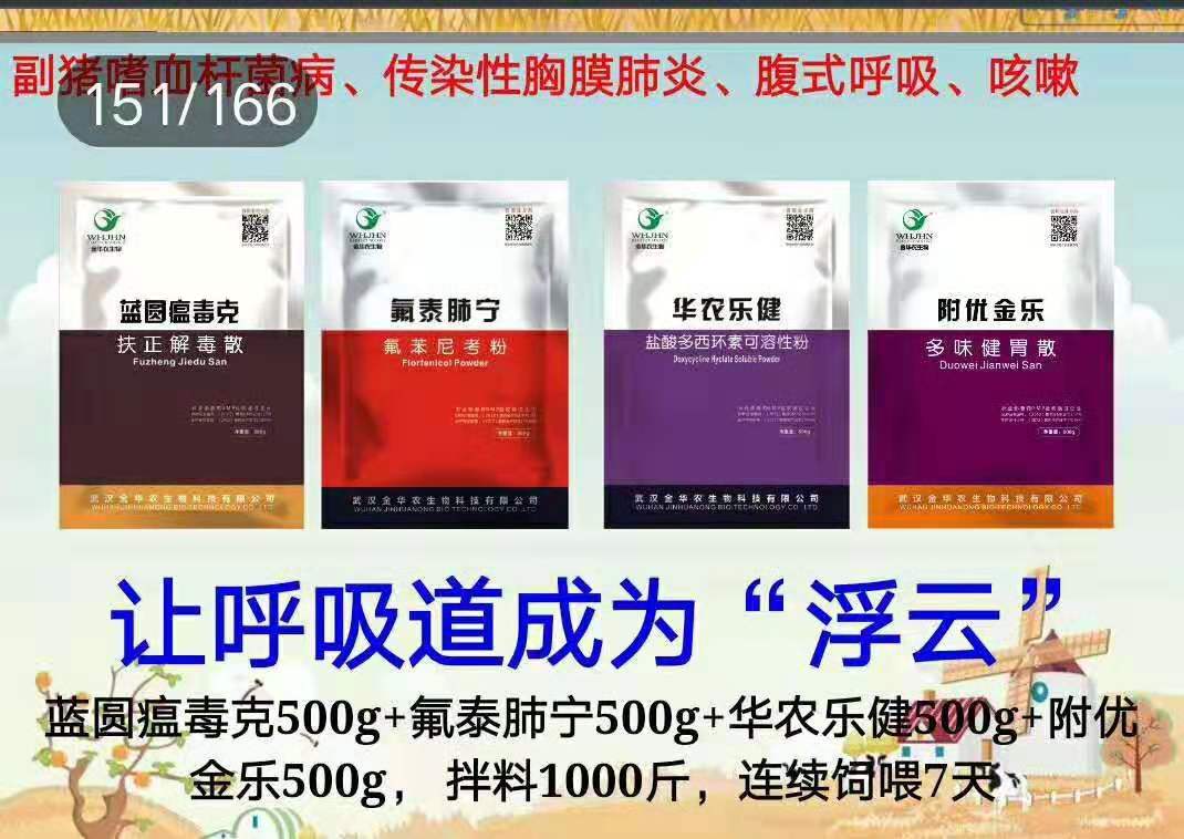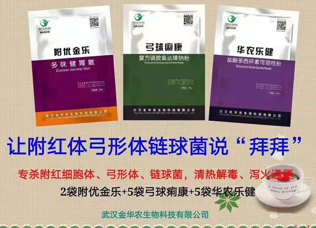 ? ?附優(yōu)金樂(lè)1kg+華農(nóng)樂(lè)健500g+弓球痢康500g+伊苯佳300g,拌料1000斤,連續(xù)飼喂7-10天,效果很好;