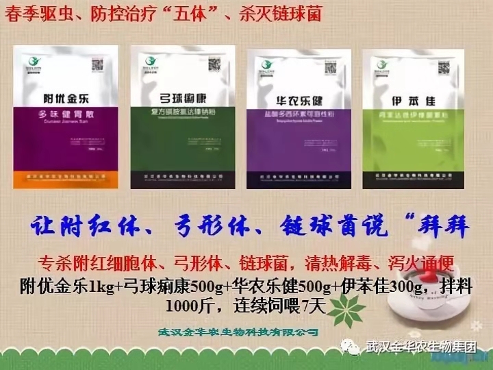 春季驅蟲,防控五體“附紅體、弓形體、支原體、衣原體、螺旋體”,殺滅一細菌“鏈球菌”很關鍵,豬群出現(xiàn),返情,配不上種,受孕率低,毛孔出血,眼屎,淚斑、尿黃,糞便干燥,皮毛粗糙、雜亂,食欲不振,喝臟水,流產,死胎:附優(yōu)金樂1kg+華農樂健500g+弓球痢康500g+伊苯佳300g,拌料1000斤,連續(xù)飼喂7-10天,臨床療效,治療效果,非常顯著。