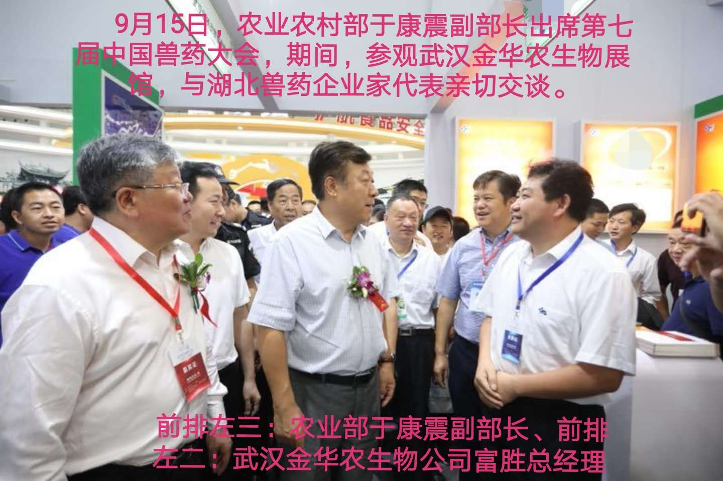 會議期間,于康震副部長參觀并視察了湖北省獸藥企業(yè)展館,親自來到武漢金華農(nóng)生物集團展館前了解企業(yè)發(fā)展情況,傾聽民聲民情,為企業(yè)解決疑難問題,關(guān)心湖北省獸藥企業(yè)的發(fā)展情況!仔細聆聽了以富勝總經(jīng)理為代表的湖北省獸藥企業(yè)家的工作匯報!并點頭微笑,肯定與贊美湖北省獸藥企業(yè)發(fā)展良好,為人民的食品安全作出貢獻!肯定武漢金華農(nóng)生物的發(fā)展迅速,科技創(chuàng)新突破,并鼓勵大干快上,為社會和行業(yè)作出應(yīng)有的貢獻,承擔應(yīng)有的社會責(zé)任!